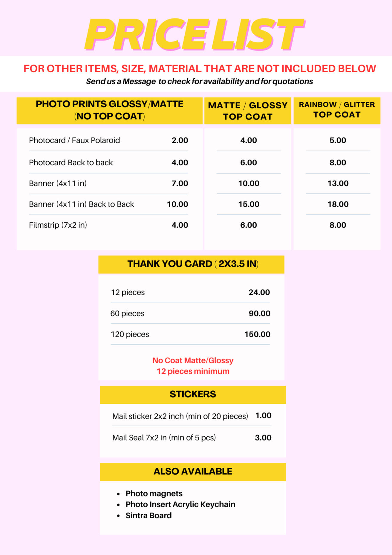 Please readcarefully before submitting an order form➨ Make sure to be 100% sure before placing an order➨ Please do inquire first and ask for availability before placing an order➨ Strictly NO CANCELLATION➨ Once Order Confirmation has been received, Cancelled orders will be subject to Cancellation fee.➨ PAYMENT FIRST before we proceed with production of your order/s➨ Fill-out the Payment form once done payingPayments and Deadline of Payment